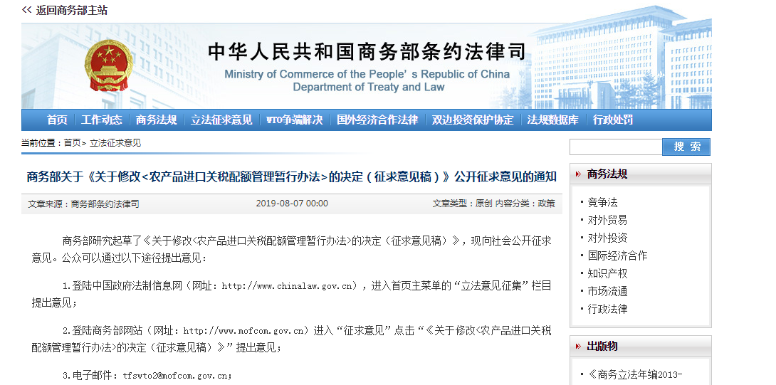 商务部网站消息,商务部就《关于修改的决定(征求意见稿)》公开征求意见。其中,将第三条修改为:“实施进口关税配额管理的农产品品种为:小麦(包括其粉、粒)、玉米(包括其粉、粒)、大米(包括其粉、粒)、食糖、棉花、羊毛以及毛条。