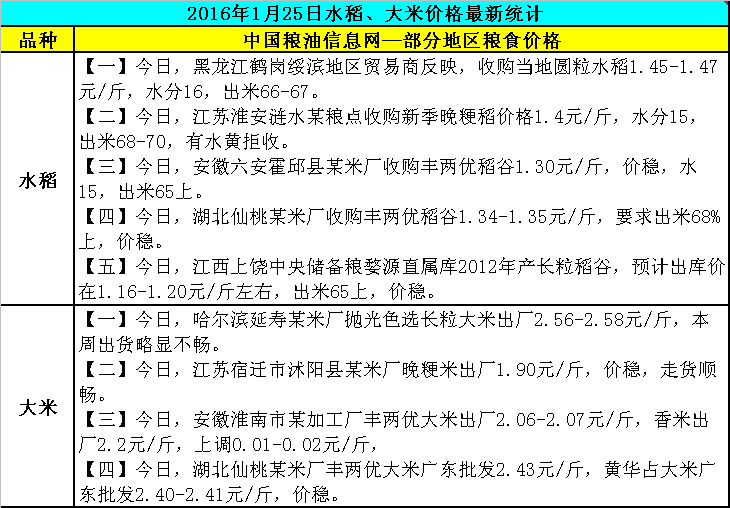 2016年1月25日水稻大米价格最新统计