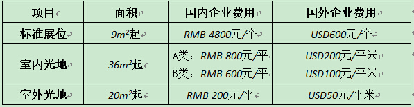 标准展位:9平米 4800元/个 ② 光地展位:36平米起租 A类:800元/平 B类: 600元/平 ③ 室外光地:20平米起租 200元/平 |