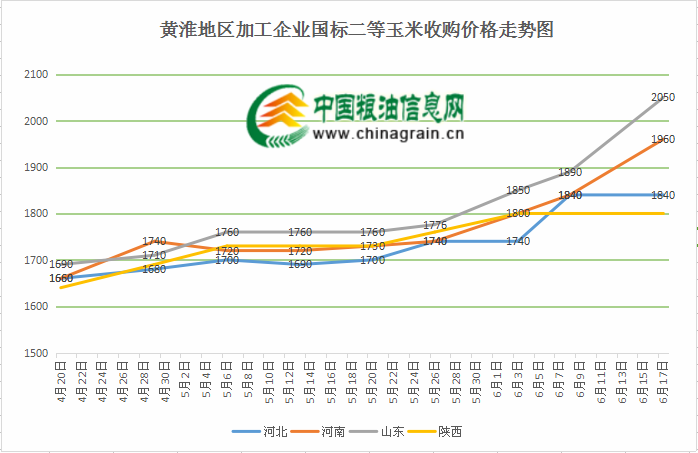 由下图可知,自4月开始直至今日,黄淮地区企业收购国标二等玉米价格直线上涨幅度达300元/吨,本周内黄淮地区市场价格整体上涨50-80元/吨,个别企业涨幅较大,达100-150元/吨。一方面是因为基础原粮不断减少,黄淮地区农户余粮已不足半成,企业库存储备偏低,无法满足生产需求,促使价格上涨明显;另一方面,国储拍卖及超期玉米定向销售开始,但主要出售为2012年陈粮,虽然成交较好,但因其质量较差,无法缓解优质玉米市场供应紧缺局面。
